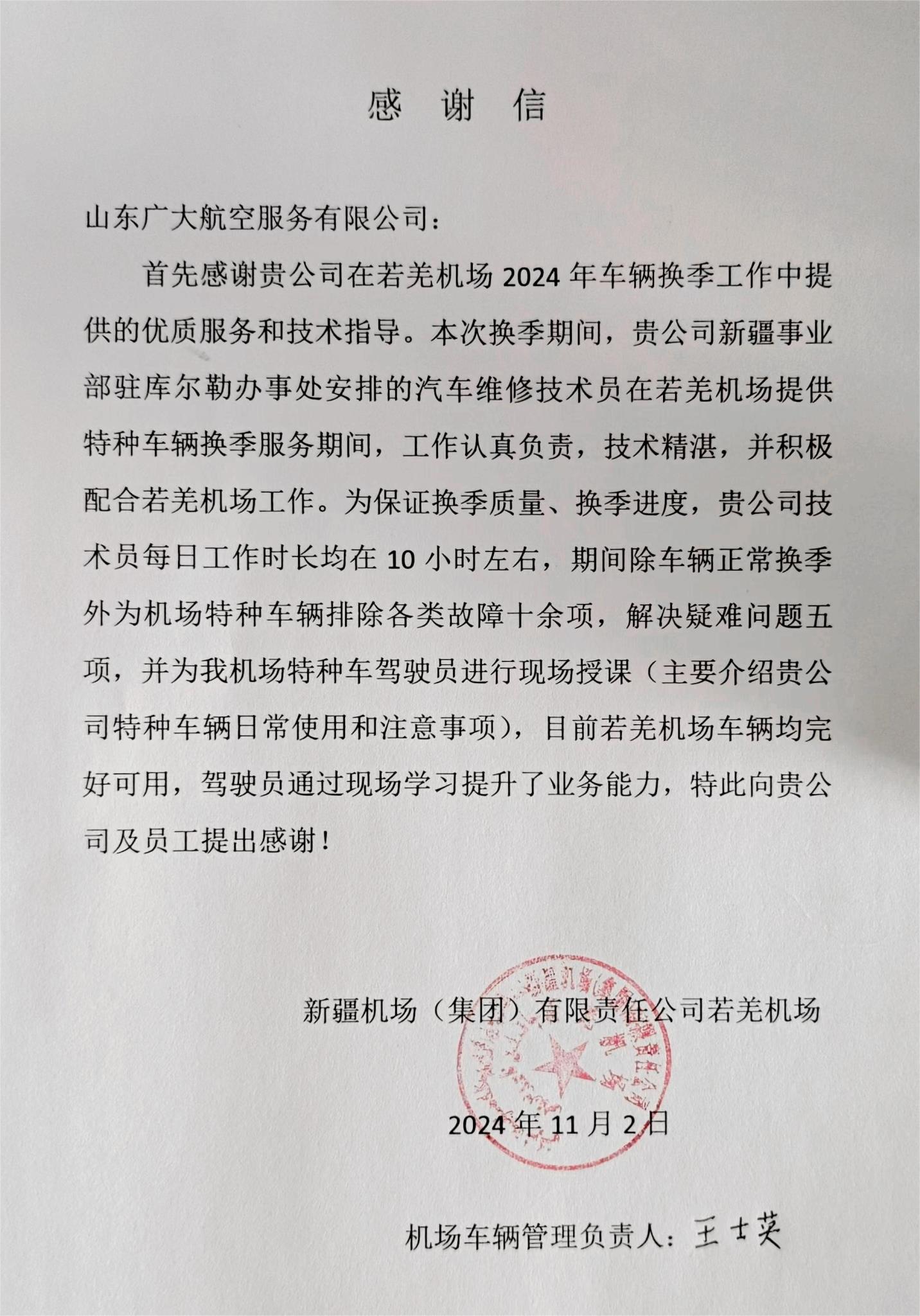 近日,新疆機場(集團)有限責任公司若羌機場向山東廣大航空服務有限公司(以下簡稱“廣大航服”)致感謝信,對其在2024年車輛換季工作中提供的優質服務和技術指導表示誠摯的感謝。若羌機場在感謝信中提到,廣大航服的汽車維修技術員在換季期間表現出色,以專業技能和敬業精神為若羌…
