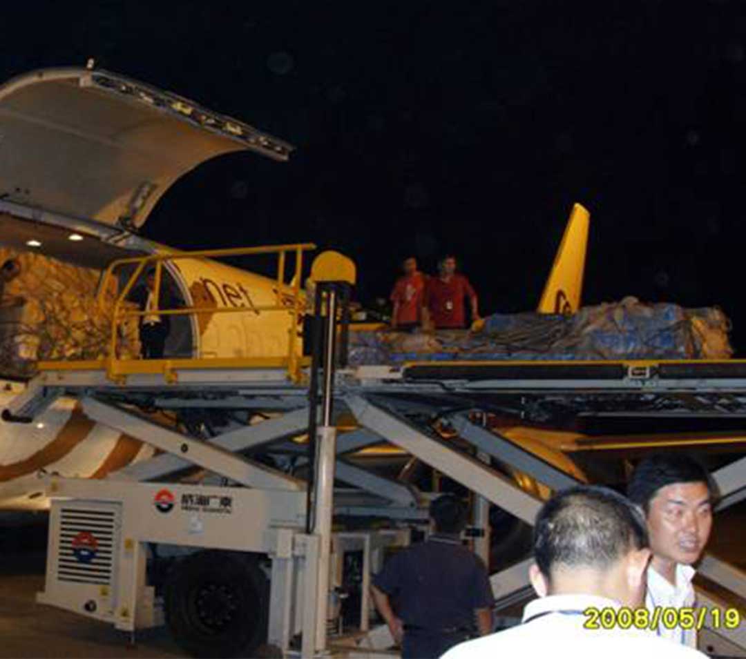 2008年5月16日,汶川地震后公司平臺(tái)車在綿陽機(jī)場(chǎng)作業(yè)